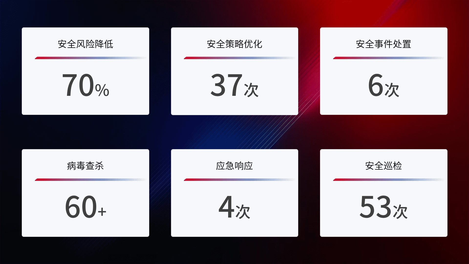提供全面的安全事件报告体系,,,,包括处置报告、、周报、、、季度和年度总结,,结合持续监控,,帮助客户深入了解网络安全状况。。。。